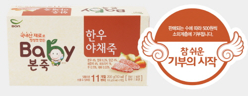 베이비본죽 제품 중 생후 11~13개월 아이를 위한 완료기에 해당하는 '한우야채죽'을 구매하면 제품 한 개 당 500원의 수익금이 기부된다. 이렇게 모아진 수익금은 영양불균형과 영양실조로 고통 받고 있는 전 세계 어린이들을 돕는데 사용될 예정이다.