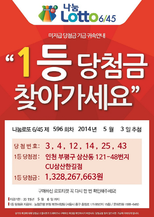 제596회차 1등 당첨번호는'14, 43, 12, 25, 3, 4(보너스 17)이며 당첨자가 복권을 구입한 장소는 인천 부평구 삼산동 판매점인 것으로 전해졌다. 1등 미수령 당첨금 지급만료 기한은 오는 5월 6일까지다.