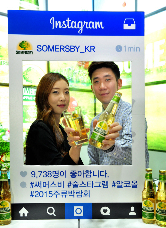 애플사이더 써머스비가 23일 서울 삼성동 코엑스에서 열린 '2015 서울국제와인&주류박람회'에서 알코올 함량 4.5도의 사과 발효주임을 알리는 인증 사진 이벤트를 펼쳤다.