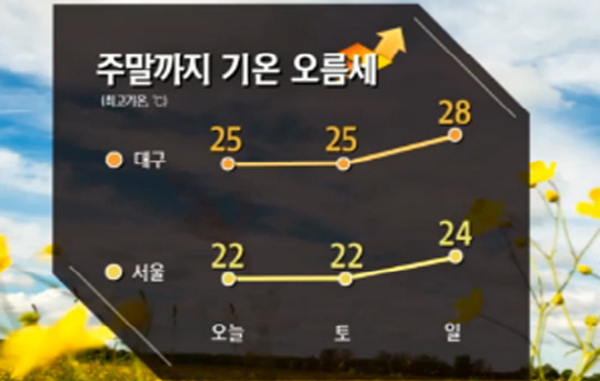 낮 기온은 서울 22도 광주 24도 대구 25도 등 한낮에는 조금 덥게 느껴지겠다. 속초는 19도로 동해안 지방은 어제보다 5도 정도 낮겠다.