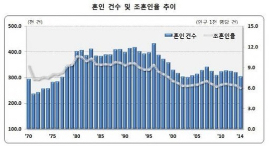 23일 통계청이 발표한 '2014년 혼인·이혼통계'에 따르면 지난해 혼인건수는 30만5천500건으로 전년보다 5.4%인 1만7천300건 감소했다. 2004년(30만8천600건) 이후 가장 낮은 수치다.