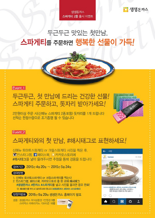 생생돈까스가 26일 신메뉴 스파게티 2종 출시를 기념해 이벤트를 실시한다고 밝혔다. 출시된 신메뉴는 토마토의 건강함을 그대로 담은 토마토스파게티와 우유를 넣어 더욱 부드러워진 크림스파게티 2종이다.