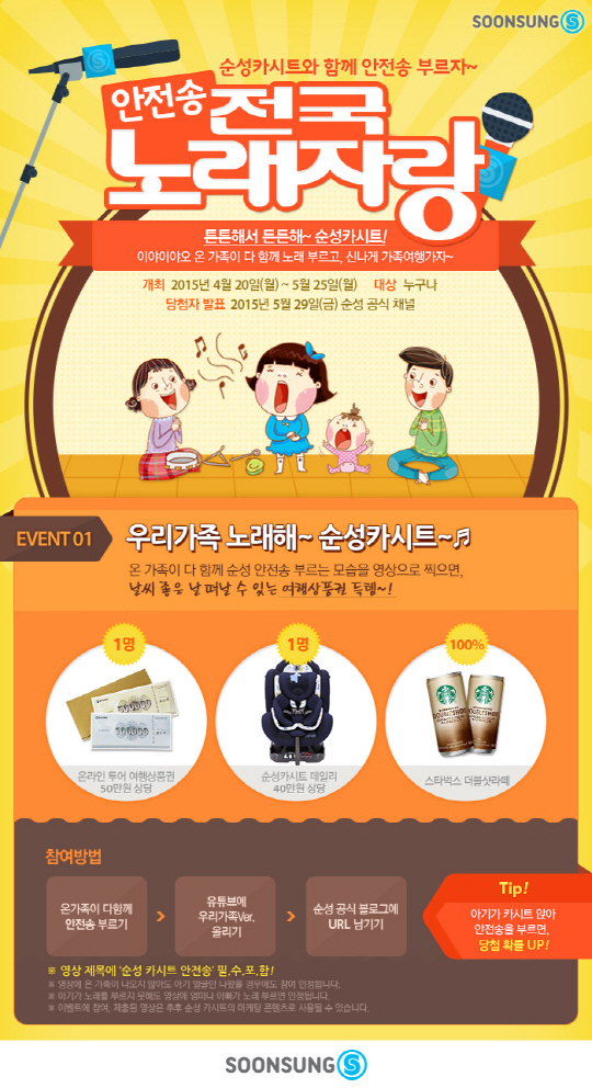 유아용 카시트 전문기업 ㈜순성산업(대표 이덕삼, www.soonsung.com)이 5월 25일까지 '안전송 전국 노래자랑' 이벤트를 진행한다.