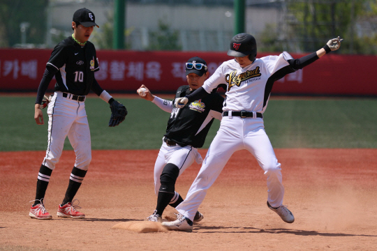 제 5회 AJ렌터카배 전국생활체육직장인야구대회' 개막전을 갖고 약 90일간의 대회 시작을 알렸다. 개막전에는 KBS '개그콘서트' 야구팀이 초청돼 주최사(社)인 AJ렌터카 야구팀 'AJ레전드'와 경기를 펼쳤다. 사진은 개그맨 이광섭씨가 땅볼타구를 처리하고 2루에서 AJ레전드 선수를 아웃시키는 모습. 경기는 15대14로 AJ레전드가 승리했다.