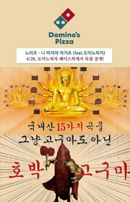 세계 최대 피자배달 전문 기업 도미노피자 측은 28일 공식 페이스북 페이지를 통해 노라조의 '니 피자야, 먹어죠'라는 CM송과 영상을 게재했다.