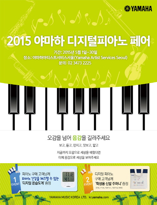세계적인 악기음향전문기업 야마하뮤직코리아㈜(대표: 야마다 토시카즈)는 5월 '가정의 달'을 맞이해 야마하 디지털피아노 전 모델을 특별가에 판매하는 '2015 야마하 디지털피아노 페어'를 실시한다고 29일 밝혔다.