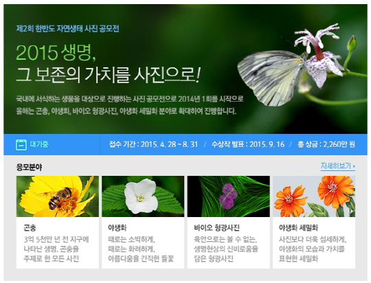 한반도 생명연구자원 이미지 확보와 활용 확산을 위해 지난해에 이어 두 번째로 열리는 이번 공모전은 곤충, 야생화 부문의 일반부/청소년부, 바이오 형광 사진, 세밀화로 보는 야생화 부문의 특별전으로 나눠 진행된다. 작품 접수 기간은 이번 달 28일부터 8월 31일까지며, 참가 희망자는 지식백과와 포토갤러리 공모전 페이지에서 응모하면 된다. 일반부/청소년부는 누구나 참가할 수 있으며 특별전-바이오 형광사진 부문은 의생명과학 분야 전공자 및 종사자만 응모 가능하다.