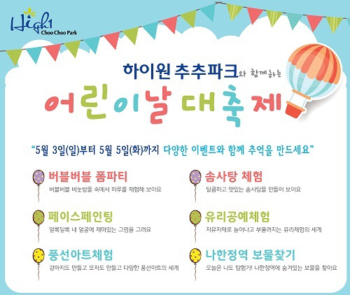 추추파크 전역에서 진행 될 이번 어린이날 대축제는 추추스테이션 부근에서 진행되는 비누거품 체험인 버블버블 폼파티를 비롯하여, 페이스 페인팅, 풍선아트체험 등 어린이들을 위한 프로그램과 나한정역에서 추억의 보물찾기 이벤트, 스위치백트레인에서는 가수 신용씨가 진행하는 기차 콘서트를 통해 가족 모두가 참여할 수 있는 다채로운 행사를 진행한다.