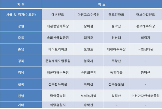 수도권인 서울 경기 지역에서는 대표적인 놀이공원 '에버랜드'가 꾸준히 1위 자리를 지키고 있다. 매년 5월 대표적인 꽃 축제 '장미축제'를 비롯해 공연, 체험 프로그램 등 다양한 이벤트가 진행돼 가족 여행지로는 최적으로 꼽힌 것. 한편 국내 대표 원예 수목원 '아침고요수목원'과 레저와 문화가 결합된 테마공원 '렛츠런파크(구 경마공원)'도 순위에 오르며 여행지 인기 명소로 각광받았다.