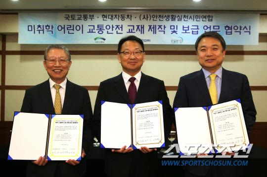 현대자동차(주)는 30일 서울 서초구 더 케이(The K) 호텔에서 유일호 국토교통부 장관, 송 자 안전생활실천시민연합(이하 안실련) 공동대표, 정진행 현대차 사장이 참석한 가운데 미취학 어린이(만 3~5세) 대상 교통안전 교재 제작 및 보급에 대한 업무협약을 맺었다.