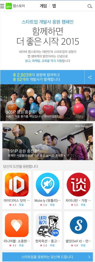 네이버 앱스토어가 스타트업 응원 캠페인 '함께하면 더 좋은 시작 2015' 페이지((http://m.nstore.naver.com/appstore/startup/main.nhn)를 오픈하고, 이번 캠페인의 첫 시작에 함께 할 40여 개의 스타트업을 소개했다.