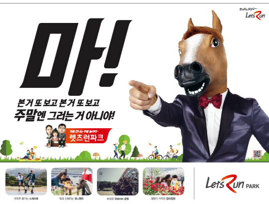 최근 온라인 상에선 '마! 주말엔 그러는 거 아니야'라는 광고가 화제가 되고 있다. 지루함에 시무룩한 아이, 가사일에 지친 아내를 뒤로 하고 소파에 누워 코를 골고 잠이 든 아빠가 살고 있는 집에 말가면을 쓴 의문의 남자가 벽을 뚫고 들어와 당근을 흔들며 '마! 자고 또 자고, 자고 또 자고 주말엔 그러는 거 아니야!'라고 호통친다. 말가면 사나이의 호통은 매일 같은 데이트 코스를 반복하는 연인들도 겨냥한다. 그러면서 새로운 주말놀이터인 렛츠런파크로 놀러오라고 유혹한다. 틀을 깬 직설화법으로 재미와 함께 강력한 메시지를 전달하고자 하는 의도다.