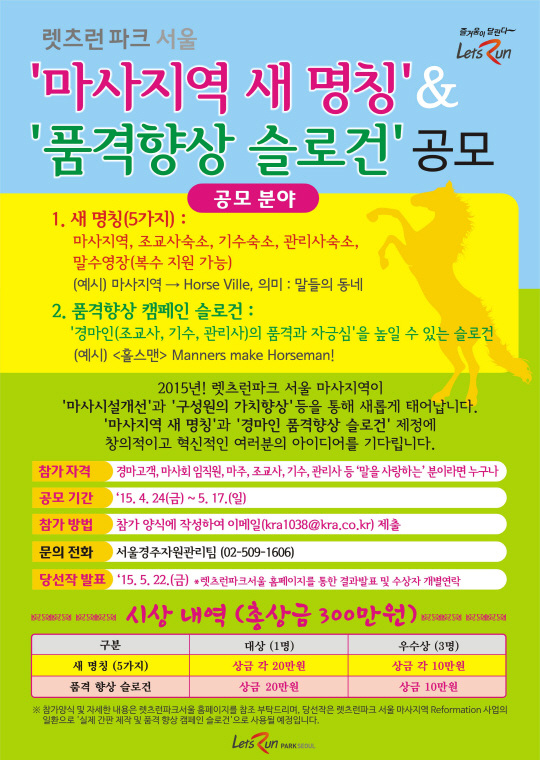 이번 공모전은 렛츠런파크서울 시설물에 새 이름을 부여하고 경마 종사자들의 품격을 높이기 위한 슬로건의 필요성으로 기획됐다. '마사지역 새 명칭'은 마사지역 및 조교사-기수-관리사 숙소, 말수영장의 명칭, '품격향상 슬로건'은 조교사, 기수, 관리사 등 경마 관계자들의 자긍심을 높일 수 있는 슬로건이 공모 대상이다. 공모전은 오는 17일까지 진행되며, 참가는 마사회 홈페이지(http://www.kra.co.kr)에서 게시된 신청서에 명칭 혹은 슬로건을 기입해 이메일(kra1038@kra.co.kr)로 제출하면 된다. 당선작은 22일 마사회 홈페이지를 통해 공개되며, 모집분야별, 명칭부여 대상별 대상 1명에 20만원의 상금이 주어진다. 우수상(3명)은 각각 10만원씩 상금을 받게 된다. 자세한 사항은 마사회 홈페이지를 참고하면 된다.
