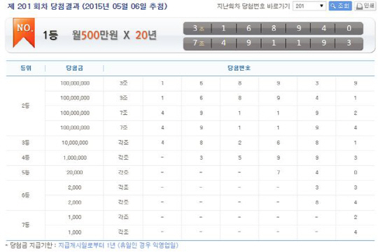 연금복권 201회 1등 당첨자에게는 20년간 매달 500만 원씩 연금 형식으로 당첨금이 지급된다. 세금을 뗀 실제 수령액은 약 390만 원 정도.