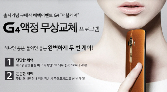 LG전자가 8일 'G4'초반 제품 구매·개통 고객들을 대상으로 1년 이내 액정 파손 시 무상으로 액정을 교환해 주는 '더블 케어' 프로그램을 업계 최초로 진행한다고 밝혔다.