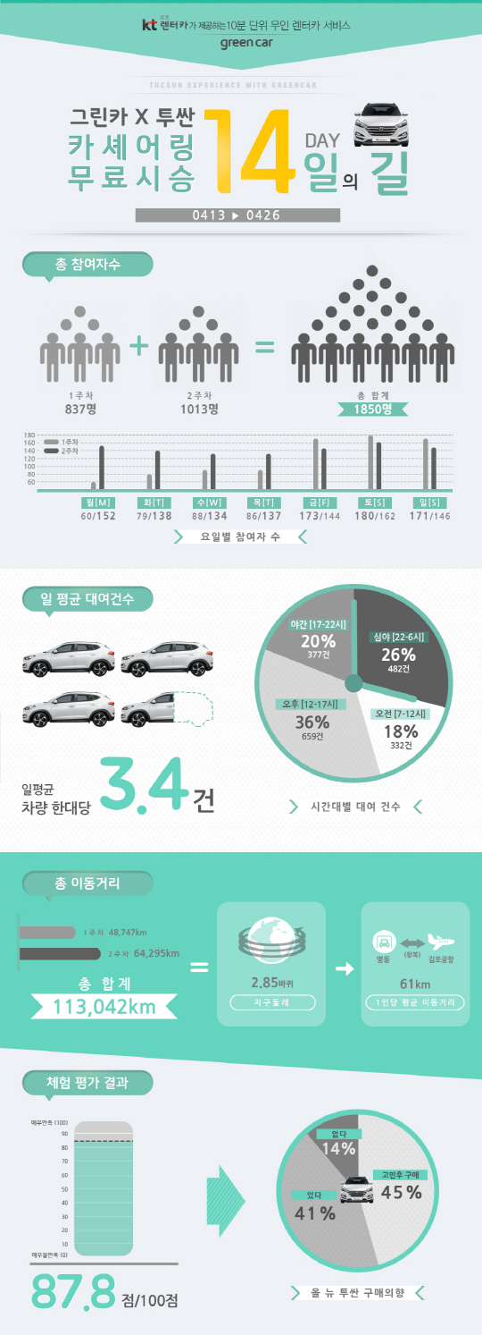 지난 2주간(4월 13일~26일)의 이용현황을 살펴보면, 무료 시승 차량이 가동된 시간은 일 평균 17시간이다. 일과시간을 넘어 심야시간까지 시승할 만큼 참여 열기가 높음을 알 수 있다. 총 이동 거리는 11만3042km로 이는 지구 둘레를 2.85바퀴 운행한 것과 같은 거리이다. 평일(월~목)보다 주말(금~일) 이용 고객이 약 49% 높게 나타났다. 또한 카셰어링 시승을 통해 차량을 이용해본 후 해당 차량(올 뉴 투싼)을 '구매하겠다'는 응답이 41%, '고민 후 구매하겠다'는 응답이 45%로 구매에 긍정적인 응답(86%)이 높게 나타났다.