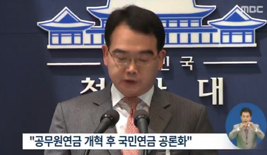 김성우 청와대 홍보수석은 10알 오전 5월 임시국회 개회와 관련한 입장 발표를 통해 "국민눈높이에 맞춘 공무원연금 개혁안 처리가 5월 국회에서 반드시 이뤄져야 한다"고 말했다.