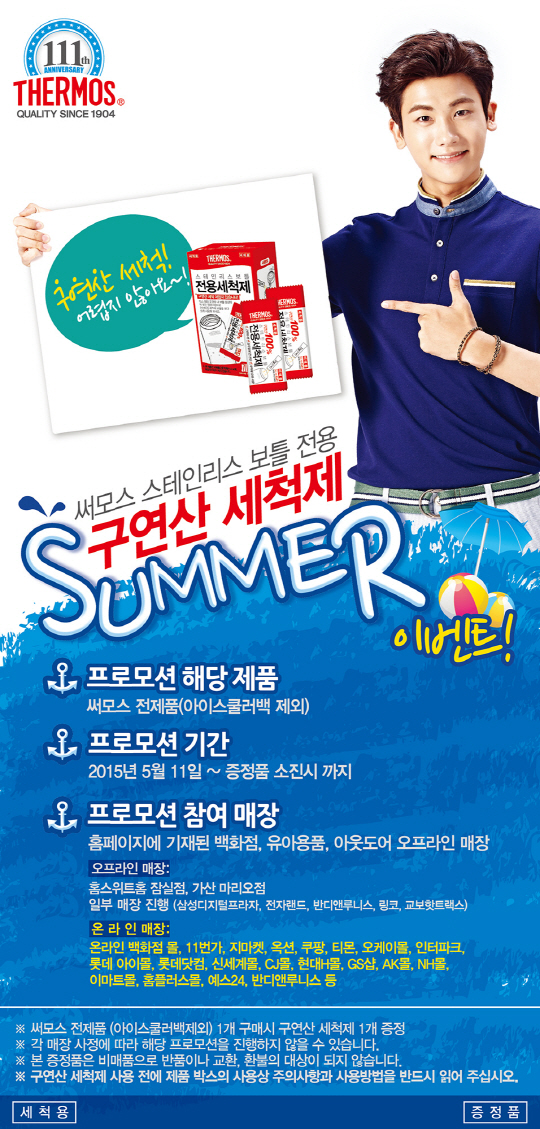 한편, 전국 주요 백화점, 유아용품전문점, 아웃도어 매장 및 온라인 쇼핑몰에서 구입시 구연산 세척제를 받을 수 있으며, 자세한 이벤트 진행 판매처는 써모스코리아 홈페이지(http://www.thermos.kr)를 통해 확인 가능하다.