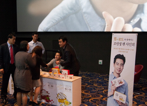 롯데제과의 프리미엄 과자브랜드 '팜온더로드'가 지난 9일 건대입구 롯데시네마에서 조인성 팬 사인회를 진행했다.
