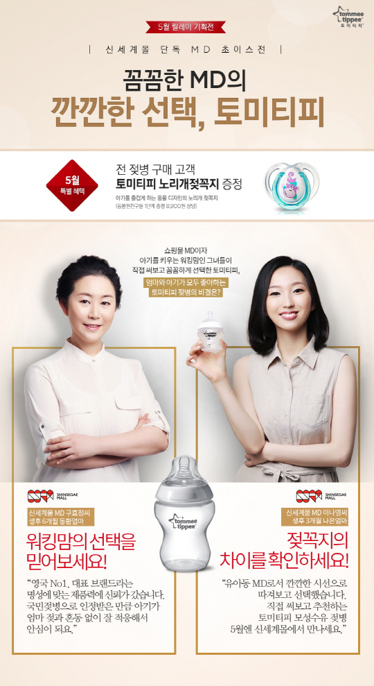 유아동 전문기업 제로투세븐(대표 조성철)이 독점 수입, 유통하는 영국 No.1 수유·이유 브랜드 '토미티피(tommeetippee)'가 5월을 맞아 신세계몰을 통해 토미티피의 모성수유 젖병을 선착순 증정하고, 모성수유 출산세트 등을 할인판매하는 'MD 초이스' 기획전을 단독 진행한다.