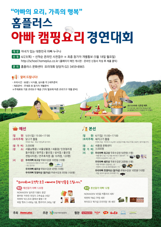 요리 주제는 닭고기 활용 캠핑요리(예선), 돼지고기 활용 캠핑요리(본선)이며 참가비는 3000원이다. 본선 1등 아빠에게는 홈플러스 문화센터 무료 수강권을 증정한다. 이 외에 테팔, 노마드, 풀무원, 락앤락, 하림, 하이포크 등에서 준비한 푸짐한 참가 선물도 전달한다. 자녀를 둔 아빠는 누구나 참여가 가능하며, 참가신청은 문화센터 홈페이지 (http://school.homeplus.co.kr)를 통해 할 수 있다.