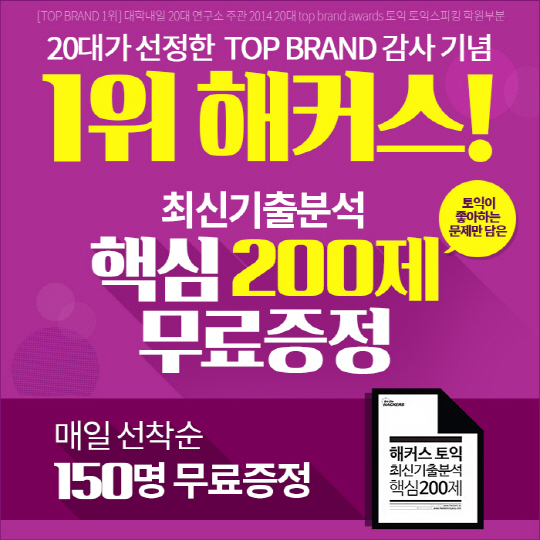 해커스인강 전재윤 대표이사는 "TOP BRAND 1위 선정은 토익의 주요 수요층인 20대가 선택했다는 점에서 더욱 의미가 크다"며 "이번 이벤트는 수험생의 토익 졸업을 응원하기 위한 것으로 해커스의 핵심 200제는 타사의 무료 토익 문제집과는 달리 문제를 사오거나 짜깁기 등을 하지 않고 직접 반복출제유형과 최신경향을 완벽히 조화해 만들었다. 단기간 토익 점수 상승을 원하는 분들의 많은 참여 부탁드린다"고 전했다.