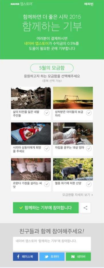 네이버 관계자는 "스타트업의 성장을 지원하는 '함께하는 더 좋은 시작 2015' 캠페인에 이어 도움이 필요한 곳에 작은 힘이라도 보탤 수 있도록 '함께하는 기부' 캠페인을 진행한다"며 "네이버 앱스토어 아용자들의 따뜻한 관심과 참여를 기대한다"고 말했다.
