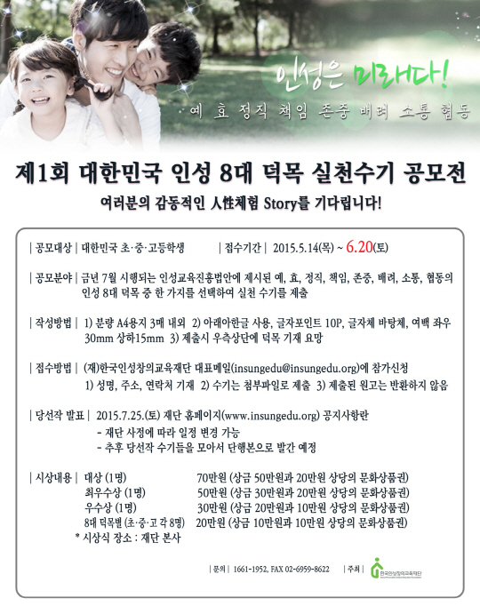 '제 1회 대한민국 인성 8대 덕목 실천 수기 공모전' 관련 문의는 한국인성창의교육재단 전화(1661-1952)와 이메일(insungedu@insungedu.org)로 가능하다.