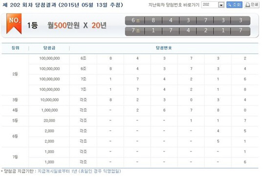 1등 당첨금은 매달 500만 원씩 20년간 연금 형식으로 지급되며 세금을 뗀 실수령액은 약 390만 원인 것으로 알려졌다.