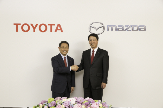 | 토요타자동차와 마츠다자동차는 경영 자원의 활용이나, 상품 및 기술의 보완 등, 상호간 시너지 효과를 발휘할 수 있도록 협력관계 구축을 위한 파트너십을 13일 체결했다. 사진 왼쪽은 토요타의 토요다 아키오 사장, 오른쪽은 마츠다의 코가이 마사미치 사장. |