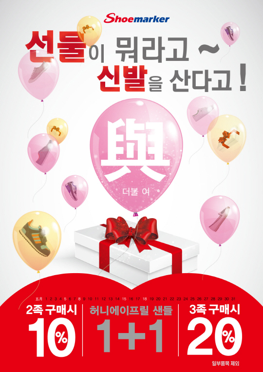 슈즈 멀티 스토어 슈마커(Shoemarker)가 5월 가정의 달을 맞이해 3족 구매 시 최대 20%까지 할인하는 '선물이 뭐라고~ 신발을 산다고!' 이벤트를 진행한다.