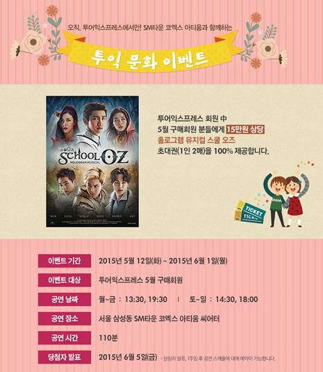 '스쿨오즈'는 동방신기의 최강창민, fx 루나, 레드벨벳 슬기, 엑소 수호, 시우민, 샤이니 KEY 등 SM 엔터테인먼트 아티스트들이 출연하는 홀로그램 뮤지컬이다. 투어익스프레스는 5월 구매회원 중 스쿨오즈 초대권 증정 이벤트 페이지에서 응모한 회원분들 전원에게 스쿨오즈 초대권(1인2매)을 제공한다. 당첨자 발표일은 6월 5일이며 당첨자 발표, 1주일 후 공연 스케줄에 예약이 가능하다.