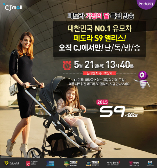 글로벌 토털 유아용품 브랜드 페도라(Fedora, www.fedora.co.kr)가 21일 오후 1시 40분에 CJ오쇼핑에서 2015 페도라 S9앨리스(Alice)유모차와 페도라 올라운드 카시트 C3 단독 방송을 진행한다.