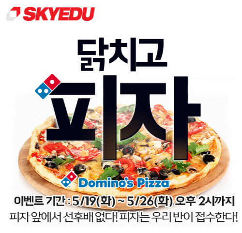 많은 입시교육전문 업체가 수험생들의 마음을 사로잡기 위해 다양한 이벤트를 진행하고 있는 가운데 '스카이에듀'가 전국 수험생의 사기를 북돋우고 응원하는 마음을 담아 반으로 피자를 배송하는 '닭치고 피자! 반배송 이벤트'를 진행한다고 밝혀 눈길을 끌고 있다.