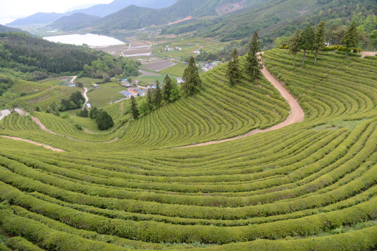 보성의 차밭은 호남정맥 분수령인 활성산(465m) 기슭에 주로 자리 잡고 있다. 보성읍과 율포 바닷가를 잇는 고갯길인 봇재 부근은 동양다원, 대한다원 등 수십만 평에 이르는 차밭이 장관을 이룬다. 그중 경관으로 치자면 대한다원이 으뜸이다. 활성산(465m) 구릉지에 자리한 매머드급 규모(99만㎡)로 하늘 향해 곧게 뻗은 장대한 삼나무 숲 진입로가 인상적이다. 차이랑이 유려한 기하학적 곡선을 그리며 산마루를 향하고 그 주위에 늘어선 삼나무의 모습이 그림처럼 펼쳐진다. 보성다원 제2농장도 완만한 구릉에 초록의 차밭이 펼쳐져 있어 탁 트인 개방감에 싱그러움이 더한다.