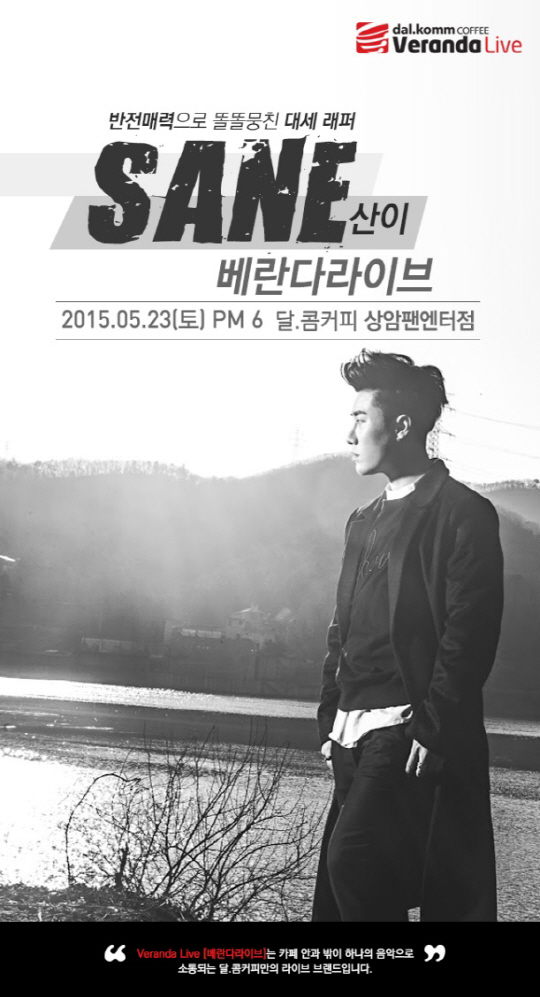 다날의 프랜차이즈 커피전문 브랜드 달콤커피(dal.komm COFFEE)는 5월의 아티스트로 래퍼 '산이'를 선정하고 23일 상암 팬엔터점에서 '베란다 라이브' 콘서트를 개최한다. 최근 정규앨범 '양치기 소년'을 발매하고 컴백한 래퍼 산이는 베란다 라이브 무대에서 타이틀곡 'Me You'를 비롯한 대중적이고 진솔한 노래들을 들려줄 예정이다. 특히 'Me You'는 산이만의 독특한 음색에 리듬감 있고 경쾌한 멜로디가 적절하게 조화된 곡으로 기분이 저절로 좋아지는 중독성 있는 노래다. 봄바람 부는 5월의 토요일 저녁 산이만의 달콤한 해피 바이러스가 베란다 라이브 무대를 채울 듯하다.