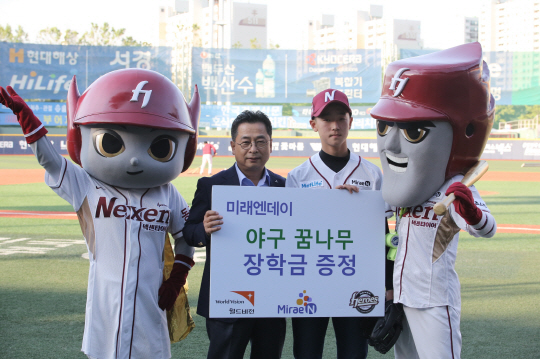 특히 미래엔과 월드비전이 응원하고 있는 고등학생 야구선수 김기한 군이 개막전 시구를 맡고 이어 장학금 수여식이 진행되면서 미래엔데이 행사에 더욱 큰 의미를 더했다.