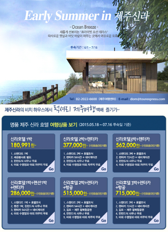 이번 여행상품의 예약 가능한 투숙일은 5월 11일부터 7월 16일 사이다. 자세한 사항은 홈페이지에서 확인 가능하며, 전화(02- 2022-6600)로 문의해도 된다.