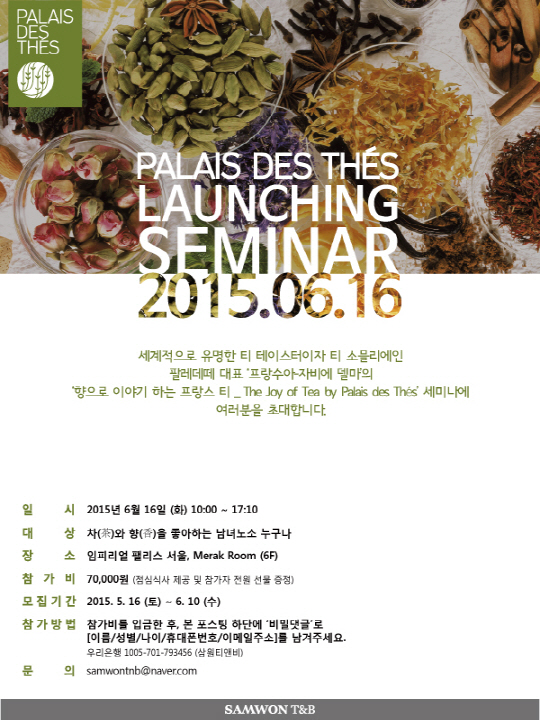 대한민국 차 문화의 대중화를 선도하는 차(茶, tea) 전문기업 ㈜삼원티앤비가 프랑스 프리미엄 티 브랜드 '팔레데떼(Palais des thes)' 국내 론칭을 기념해 6월 16일 '팔레데떼 론칭 기념 세미나(Palais des thes Launching Seminar)'를 개최한다.