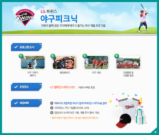 GS&POINT가 유자녀고객들을 위해 마련한 스포츠 프로그램 중 하나인 'LG트윈스 야구피크닉 1차'는 가족이 함께 전문 코치에게 야구를 배우고 즐길 수 있는 야구 체험 프로그램이다. LG트윈스 코치로부터 기본기를 배우고 야구 게임 및 다양한 레크리에이션 등을 통해 가족애를 돈독히 하며 야구에 대한 흥미를 높여줄 예정이다.