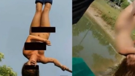 미모의 젊은 여성이 나체로 번지 점프를 해 논란이 되고 있다.