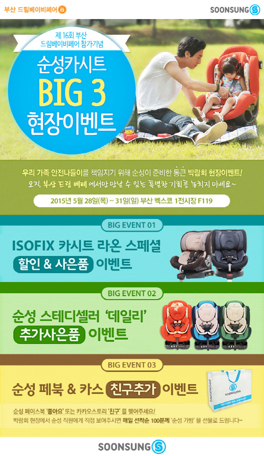 이번 박람회에서 순성산업은 제1전시장 브랜드 부스(F119)를 통해 신제품 '라온(LAON)'의 스페셜 할인은 물론 순성의 스테디셀러 '데일리 카시트' 구매 고객에게 추가 사은품을 증정하는 등 '부산 드림 베페 참가 기념 BIG 3 현장 이벤트'를 진행한다.
