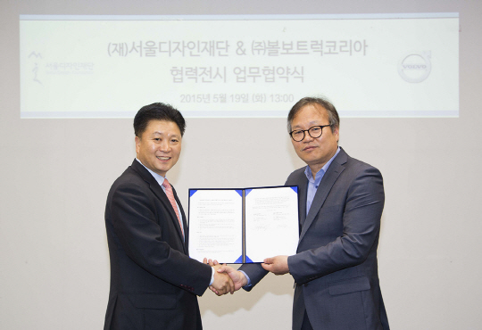 김영재 볼보트럭코리아 사장(왼쪽)과 이근 서울디자인재단 대표이사(오른쪽)가 동대문디자인플라자(DDP)에서 협약식을 맺고 '모두를 위한 안전 디자인 전'을 통해 방문객들을 대상으로 교통안전에 관한 다채로운 프로그램을 선보인다.