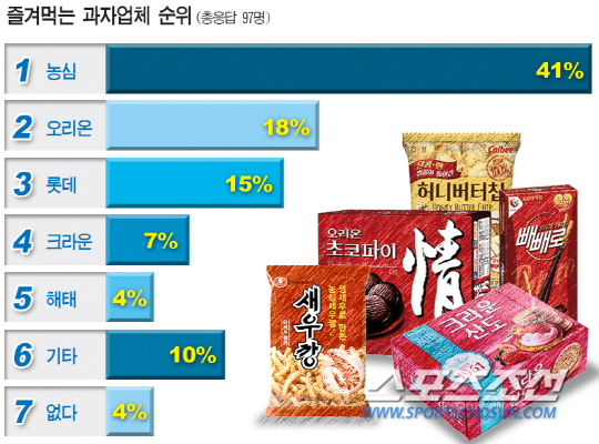 이밖에 크라운(7명, 7%)이 4위, 해태(4명, 4%)가 5위에 올랐다. "특별히 즐겨먹는 과자가 없다"는 주부도 4명 있었다.