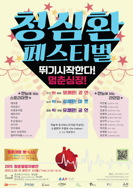 사회적기업인 사단법인 오픈핸즈는 오는 30일, 31일 양일간 AX홀(5호선 광나루역)에서 청춘페스티벌 '청심환'을 개최한다고 28일 밝혔다. 청심환은 취업난에 답답하고, 미래에 대한 불안감에 고민하고 있는 청년층을 위해 기획된 페스티벌이다. 오픈핸즈가 주관하고 ㈜래딕스, 로렌조컴퍼니, 기부이펙트, 하늘색콘서트, 베이드 커뮤니케이션, AXHall, 임팩트스퀘어, TED×SNU, 라이프스퀘어가 협력해 진행된다. 알바생, 취업준비생, 휴학생, 대학생, 고교생 등 청춘이라면 누구나 참가가 가능하다.