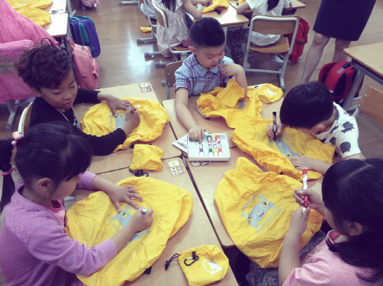 한국토요타가 5개월 간 전국 40개 초등학교 학생들을 대상으로 한 '토요타 에코 & 세이프티 아카데미'를 개최한다. 사진은 지난 26일 의정부 송양초등학교 학생들이 토요타 세이프티 아카데미에서 방수 가방커버를 만들고 있는 모습.