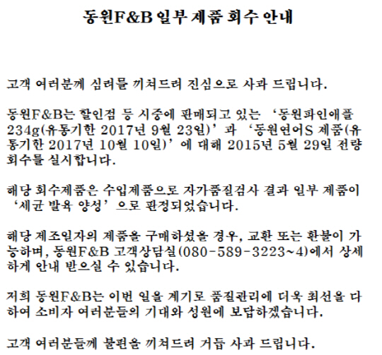 동원 F&B측은 해당 제품을 구매한 소비자에게 교환 또는 환불 조치하고 있으며, 동원 F&B 고객상담실(080-589-3223∼4)에서 상세한 안내를 받을 수 있다고 밝혔다.