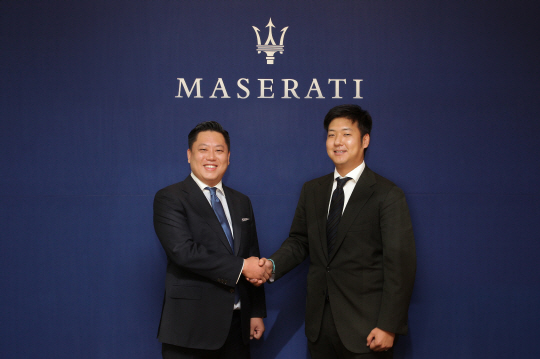 마세라티 공식 수입사 ㈜FMK는 1일 라 프리마 천일㈜와 딜러십 계약을 체결했다. 이날 열린 체결식에 참석한 라 프리마 천일 박치현 대표(왼쪽)와 FMK 이건훈 대표가 악수를 나누고 있다.