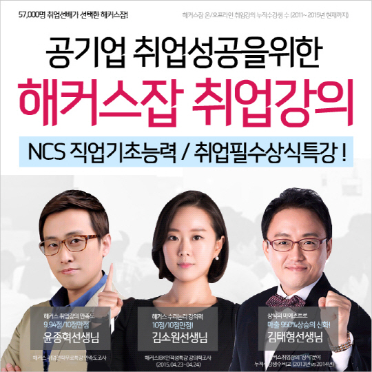 강의는 공기업 취업 관련 저서 집필 및 공기업 외부 면접관 경험이 있는 해커스 취업특강 만족도 '9.94점(10점 만점)'의 윤종혁 강사를 비롯해 해커스 수리논리 강의력 10점 만점의 김소원 강사, 해커스 취업강의 상식분야 매출 950% 상승을 기록한 김태형 강사가 진행해 신뢰도 높은 정보를 제공한다.