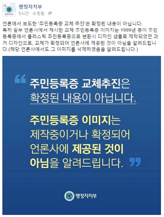 또 행자부는 페이스북을 통해서도 '주민등록증 교체 추진은 확정된 내용이 아니다'라는 문구 적힌 이미지를 공개했다.